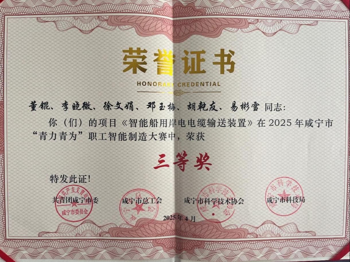 近日,由咸宁市团委联合咸宁市总工会、咸宁市科学技术协会、咸宁市科技局主办的咸宁市“青力青为”职工智能制造大赛决赛在咸宁市青少年宫成功举行,公司董锟、李晓微、徐文娟、邓玉梅荣获三等奖。