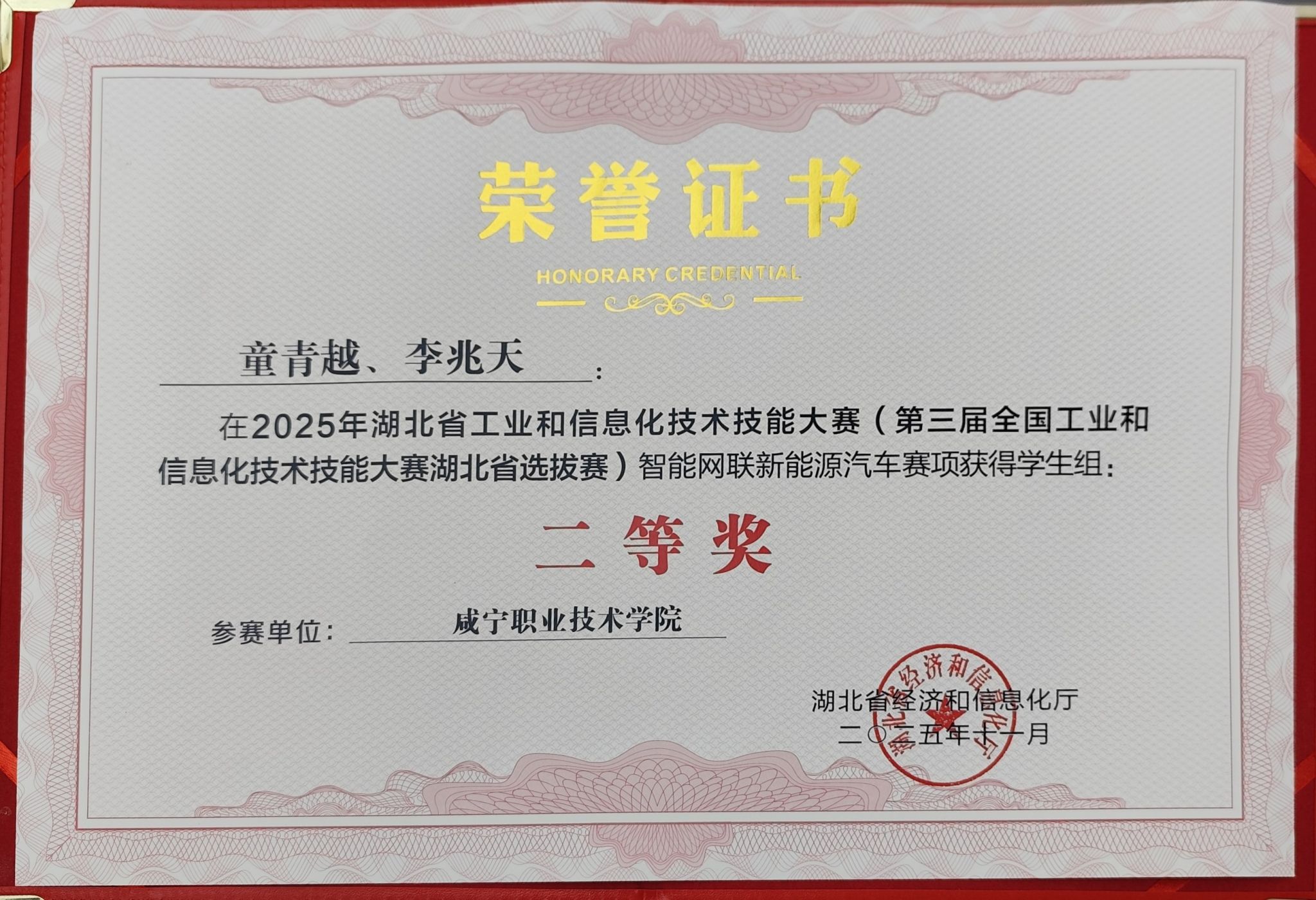 11月2日,2025年湖北省工业和信息化技术技能大赛暨第三届全国工业和信息化技术技能大赛湖北省选拔赛在武汉职业技术大学落下帷幕。永利集团304学子童青越、李兆天在“智能网联新能源汽车”赛项中脱颖而出,荣获员工组二等奖,为公司赢得了荣誉。