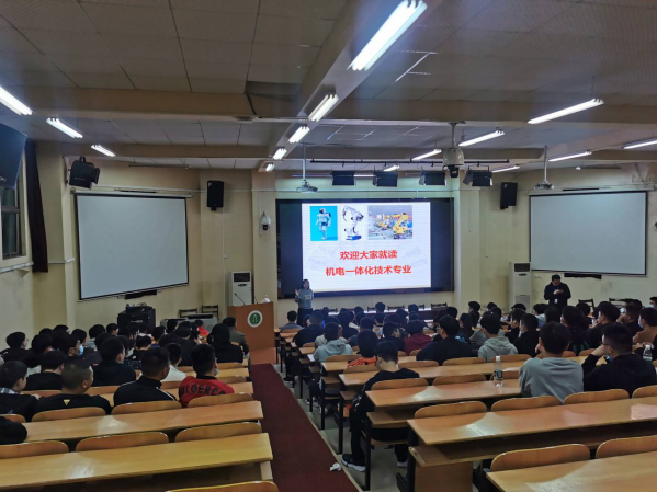 2020年10月16日晚7:30,在教1201教室永利集团304官网智能装备系教师和2020级机电一体化技术专业的新生欢聚一堂,举办了2020级机电一体化专业新生的入学教育。由智能装备系陈楠老师围绕“公司介绍”、“专业认识”、“如何读好大学”三个方面作了精彩的入学教育报告,对机电一体化行业的现状和发展趋势、人才的培养模式等进行了讲解。从学习、生活、职业规划三个方面给新生们提出建议,并期望20级新生“胸怀大志、早日成才”。