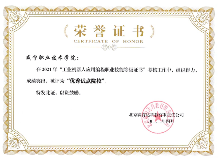 近日,教育部工业机器人应用编程职业技能等级证书培训评价组织北京赛育达科教有限责任公司公布2021年“1+X”试点优秀单位获奖名单,公司获批优秀试点院校。