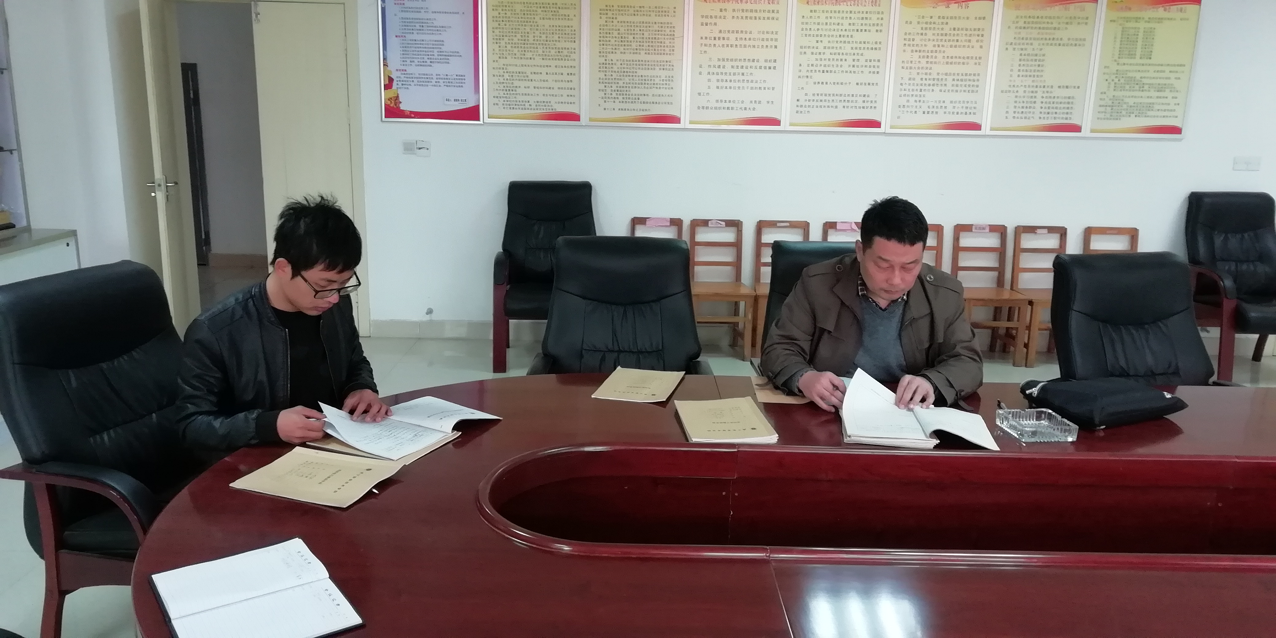图1 智能装备系主任杨彦伟、机械制造系主任钟昌清在对16级顶岗实习教师手册进行检查