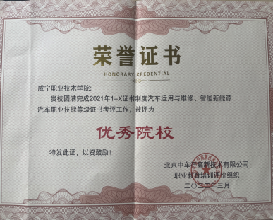2022年度,公司新能源汽车技术专业在1+X证书制度考评工作中表现良好,做到课证融通,考核成绩优良、通过率高,圆满完成了各项考核工作任务,被北京中车行高新技术有限公司职业教育培训评价组织评为“先进院校”。