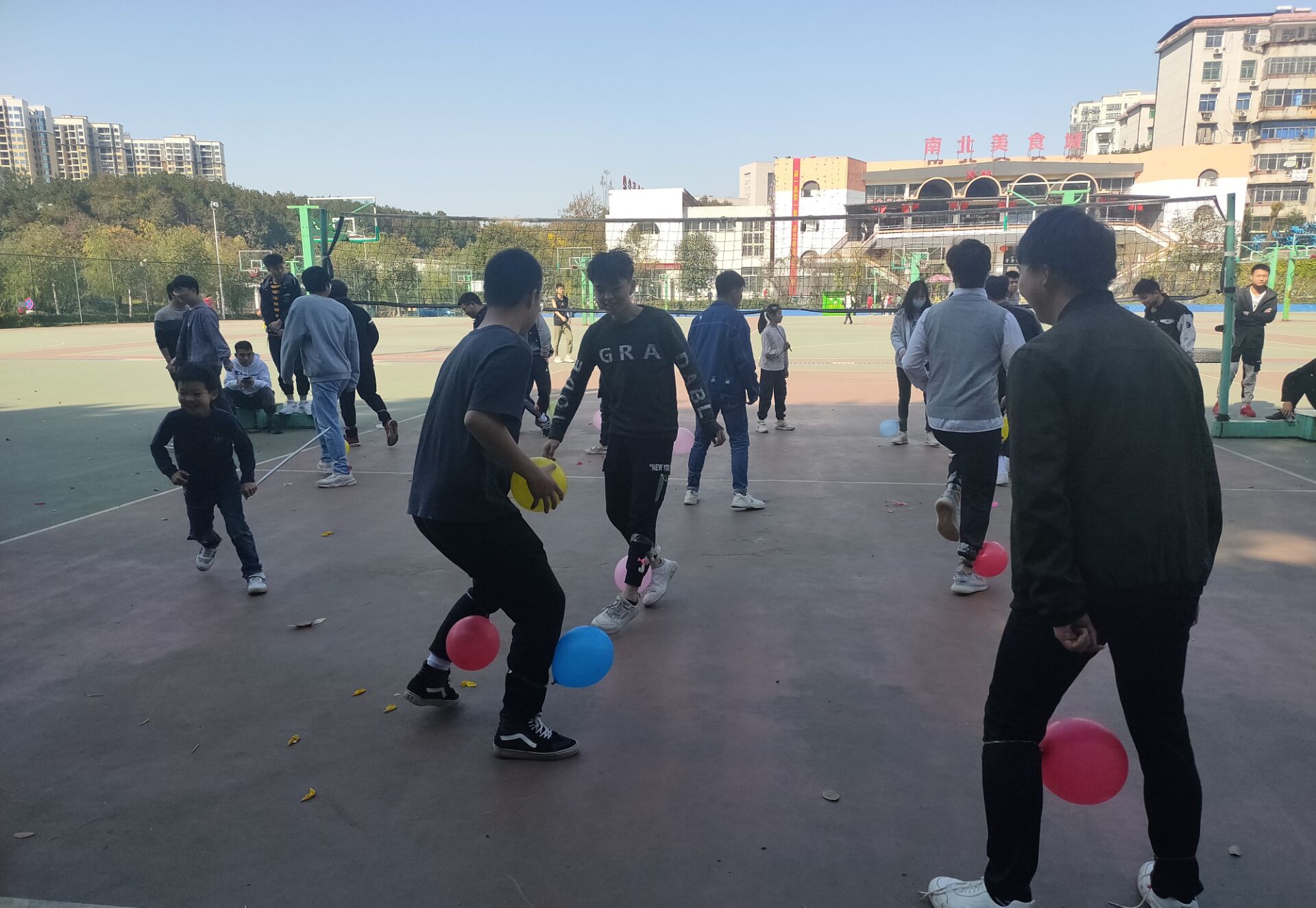 大家围着一圈,里一圈外一圈,分为六组,每组约六个人。 每个小组的目标是踩破对方小组代表脚上的全部气球,只要代表的气球被全部踩破,则输。限定比赛时间,计时结束后,看哪一方脚上的气球多者为胜。现场气氛异常活跃。