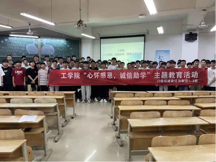 2022级机械设计与制造专业1-3班主题班会现场,辅导员杨华权宣读了《永利集团304关于开展2023年员工资助诚信教育主题活动实施方案》,员工代表王兴鹏向同学发起了“心怀感恩、诚信助学”诚信倡议,最后现场师生进行了诚信教育活动签名。