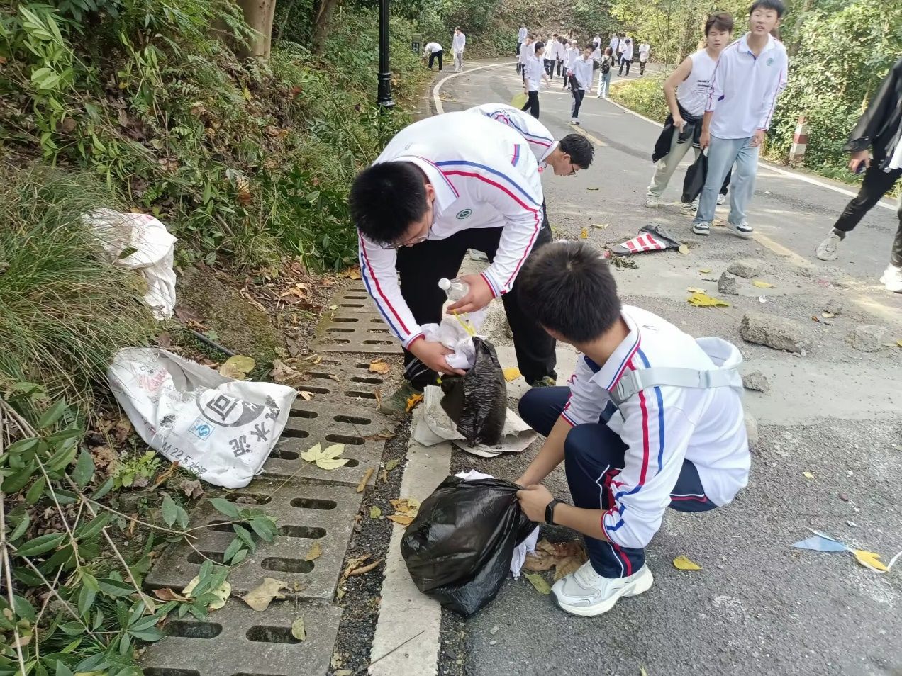 随后,志愿者们兵分两路,手提垃圾袋,干劲十足地投入到潜山的清洁工作中。他们不畏辛苦,仔细搜寻着每一个角落的垃圾,并将其一一清理装袋,最终送往附近的垃圾桶。在清洁过程中,志愿者们不仅展现了高度的责任心和团队协作精神,还积极向公园内的游客宣传环保知识,倡导大家共同爱护公共环境,不随地乱扔垃圾。