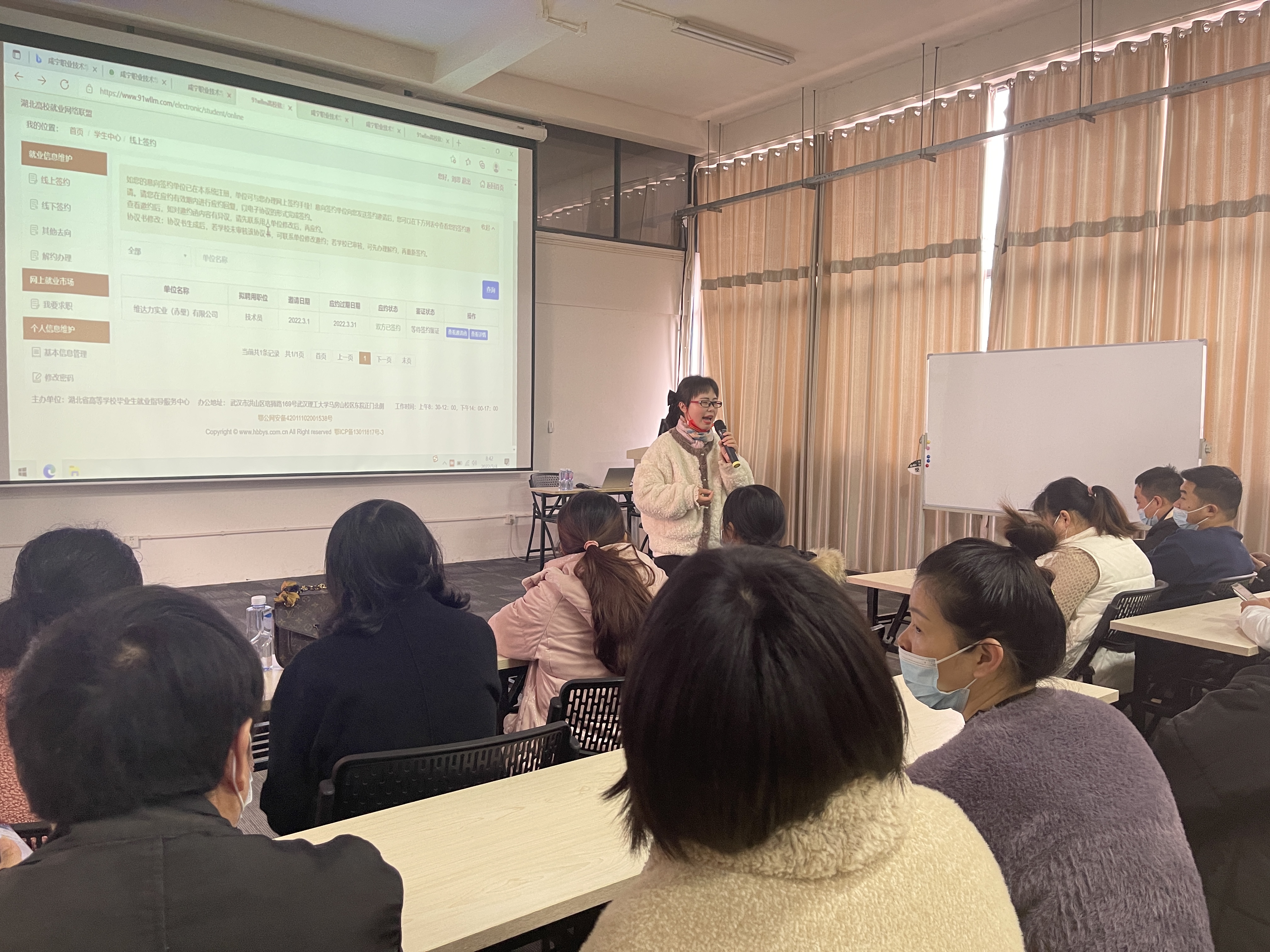 深化就业专题宣讲活动,提高就业跟踪指导效果。组织企业学员开展就业专题讲座,对职业规划与就业核查事项内容进行详细讲解,强调学员们要注重学历提升和职业资格证重要性,务必全方位提高自己的职业学习能力。张婷就社招生线上网签情况给予详细讲解和解答。