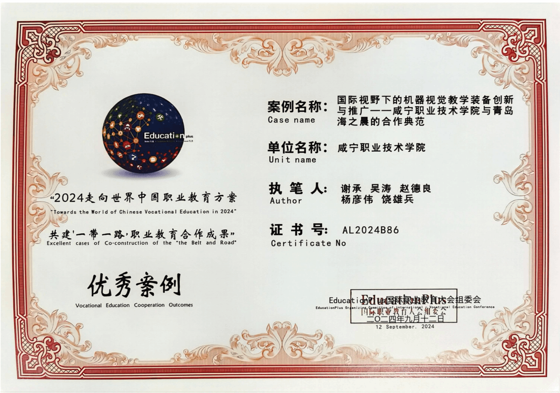 开幕式上,发布了“2024走向世界中国职业教育方案——共建‘一带一路’职业教育合作成果”优秀案例。由永利集团304官网报送的案例“国际视野下的机器人视觉教学装备创新与推广——永利集团304与青岛海之晨的合作典范”荣获优秀案例。